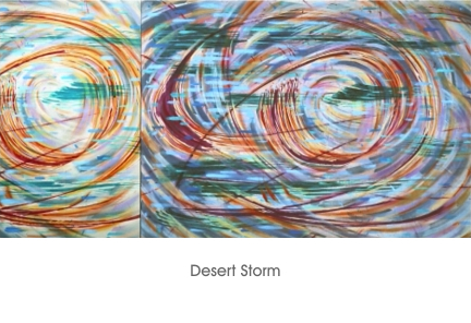 Multiple compositions on a variety of canvases and papers represent the variegated color and dynamic space in abstract skies of the Southwestern landscape. Visual planes of painted canvases combine to express, and thus, represent, shifting images one experiences while moving about in space throughout the greater Southwest region of the United States.