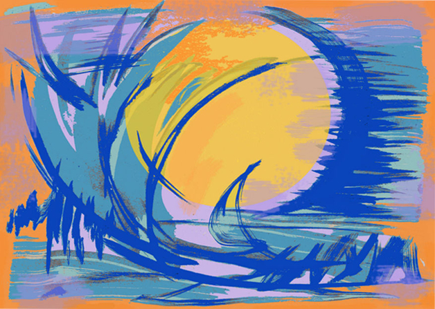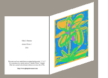 This note card was made from an original giclée print, 17" x 22." It is one piece in a recent series of Atomic Flower images. Glen has created color-formed, abstract art since the 1970s.